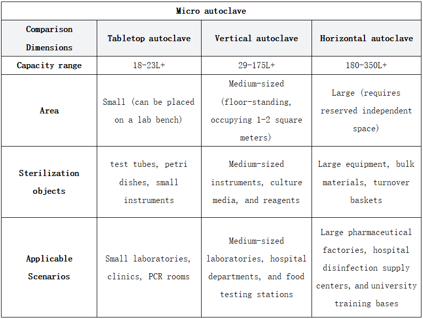 Tabletop autoclave: Compact and flexible, suitable for spaces with limited space. Features: It is small in size and takes up little space, so it can be placed on a table or a mobile shelf. They are typically small in capacity and suitable for small-batch sterilization. It is easy to operate and suitable for routine daily disinfection. Applicable scenarios: Small laboratories, clinics, dental clinics. Places that require frequent small-scale sterilization, such as school teaching laboratories. Advantages: The price is relatively low, making it suitable for users with limited budgets. Easy to install, no special modifications required. Limitations: It has limited capacity and cannot handle large quantities of items. II. Vertical Autoclave: Balances capacity and space, with wide applicability. Features: With a capacity between tabletop and horizontal models, it is suitable for medium-sized sterilization needs. The compact design allows for vertical placement and saves floor space. Applicable scenarios: Medium-sized laboratories, hospital testing departments, and biotechnology companies. Users who need to handle a variety of items, such as culture media, instruments, and liquids. Advantages: The capacity is moderate and can meet most daily needs. It is feature-rich and highly flexible. Limitations: Priced higher than desktop computers, it is suitable for users with a certain budget. It requires a certain amount of installation space. III. Horizontal Autoclave: Large capacity and high efficiency, suitable for large-scale sterilization. Features: It has a large capacity and can process a large number of items at once. They are typically equipped with advanced control systems and safety devices. Suitable for high-intensity, large-scale sterilization tasks. Applicable scenarios: Large hospital central supply rooms, pharmaceutical factories, and industrial-grade laboratories. Locations that require the handling of large quantities of equipment, culture media, or waste. Advantages: Highly efficient and time-saving, suitable for high-intensity use. It has a high degree of automation, reducing manual operation. Limitations: It takes up a lot of space and requires a dedicated area. The price is relatively high, making it suitable for users with a sufficient budget. III. Three-Step Recommendation for Product Selection Still unsure how to choose after reading the above analysis? Don’t panic! Remember these three steps to easily lock in the answer: